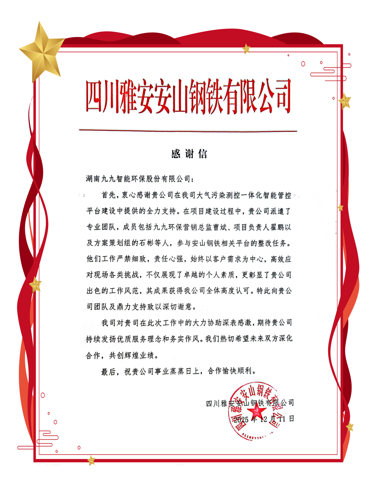 12月11日,我们收到了来自合作伙伴四川雅安安山钢铁有限公司(以下简称“安山钢铁”)的诚挚感谢信。信中,安山钢铁对我司在“大气污染测控一体化智能管控平台”建设项目中提供的专业支持与卓越服务给予了高度评价与肯定。这不仅是一份荣誉,更是对九九团队专业能力与服务精神的又一次生动印证。