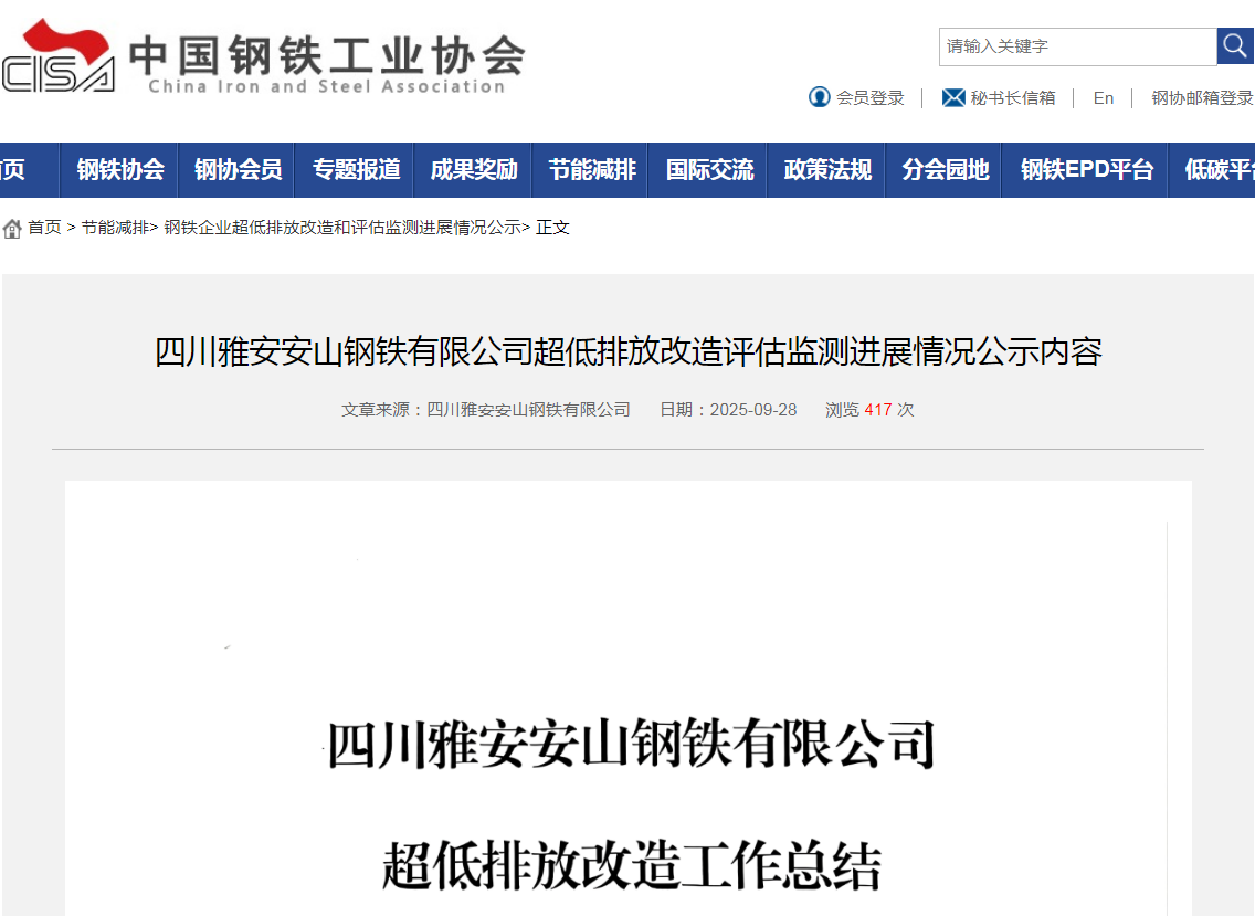 此前,安山钢铁超低排放改造评估监测进展情况已在中国钢铁工业协会官网挂网公示。