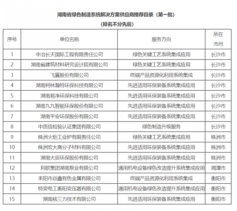 近日,湖南省工业和信息化厅发布《湖南省绿色制造系统解决方案供应商推荐目录(第一批)》,全省共有15家企业入选,其中湖南九九智能环保股份有限公司与其他7家长沙企业登榜。