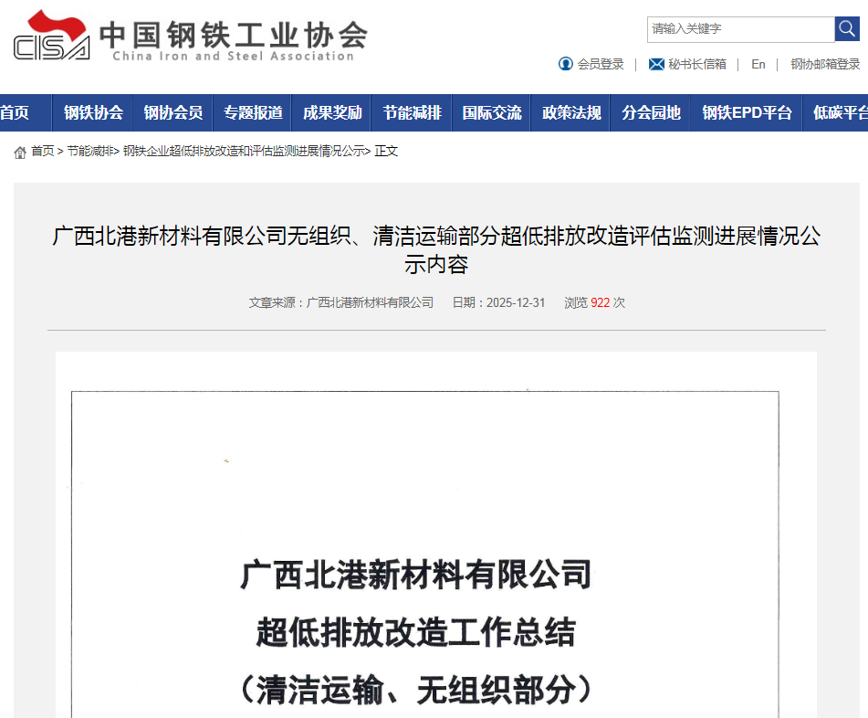 近日,广西北港新材料有限公司(以下简称“北港新材料”)的超低排放工作总结(清洁运输与无组织排放部分)在中国钢铁工业协会官方网站正式公示。该项目由九九智能环保于2025年4月承建,并于同年7月全面建成,目前相关设施运行稳定,标志着北港新材料在绿色低碳转型道路上迈出了坚实一步。