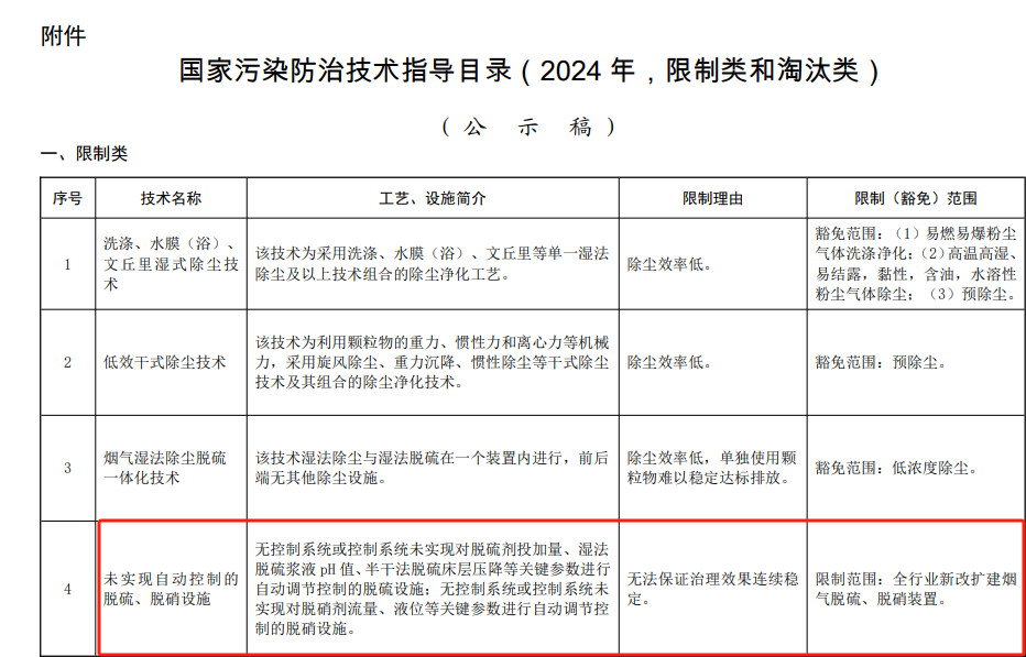 生态环境部发布的《国家污染防治技术指导目录(2024年,限制类和淘汰类)》犹如一记惊雷,明确划出了一条红线:对于那些未实现自动控制的脱硫脱硝设施——即无控制系统或无法对脱硫剂、脱硝剂投加量等关键参数进行自动调节的设施,国家将在全行业的新改扩建项目中进行限制使用。