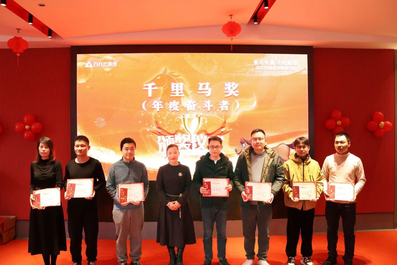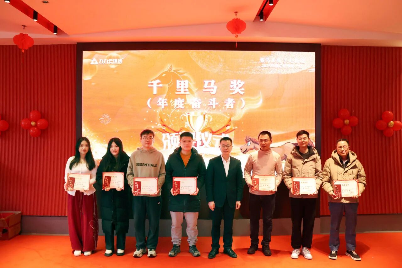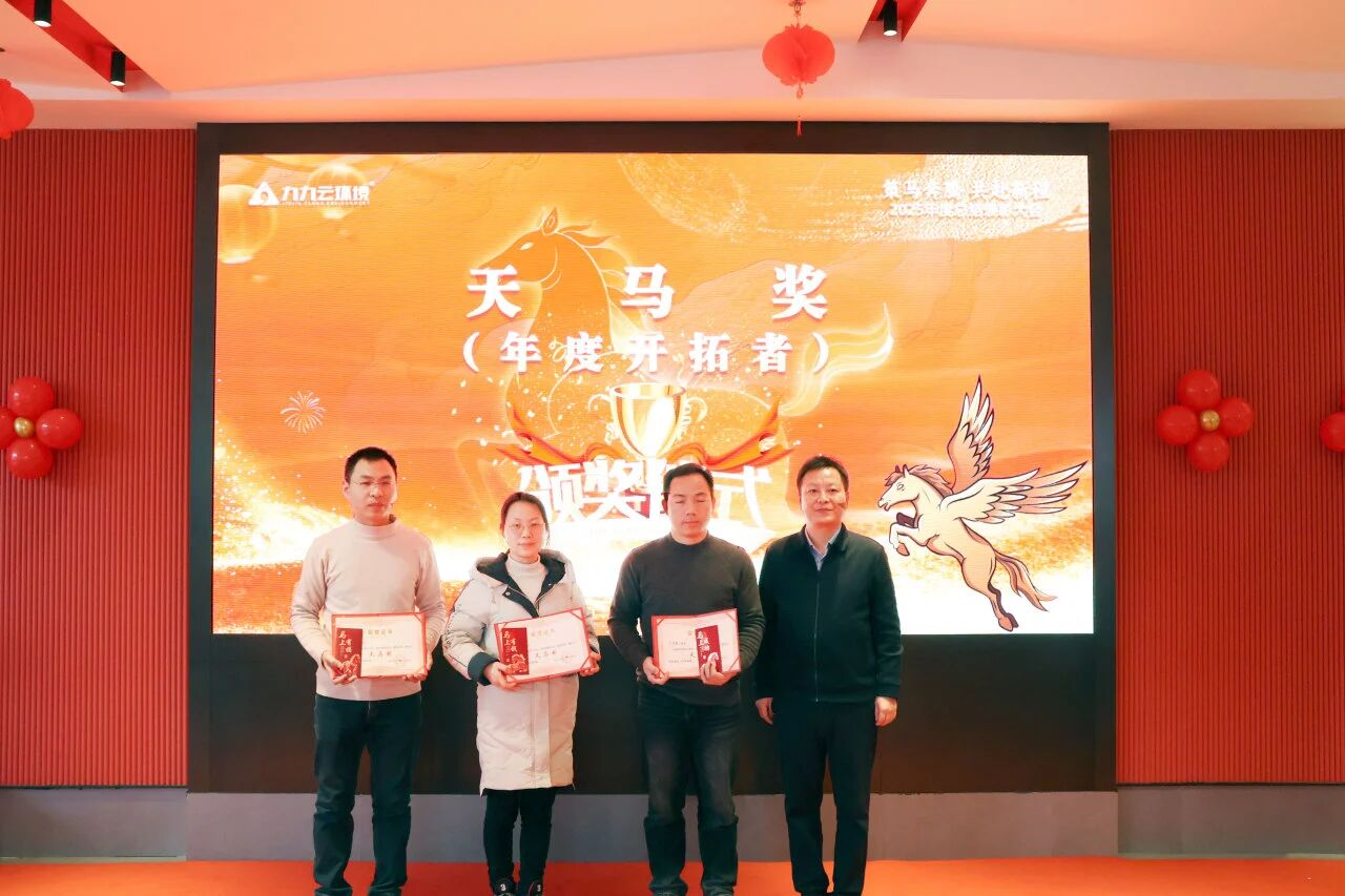 在激昂的乐章与如潮的掌声中,大会迎来了最受瞩目的颁奖环节。三十余位优秀个人及团队依次登台,接受属于奋斗者的高光时刻。值得关注的是,本届表彰以“马文化”为精神脉络,赋予奖项更深层的寓意:从“新马驹”的初露锋芒,到“骏马”的日拱一卒,从“千里马”的久久为功,到“天马”的敢为人先——这不仅是对过去一年实干者的郑重致谢,更是九九人奋斗的生动写照。而“龙马团队”与“金马奖”的颁发,则将荣誉献给了那些既能打硬仗、又能点亮他人的标杆团队与管理骨干。