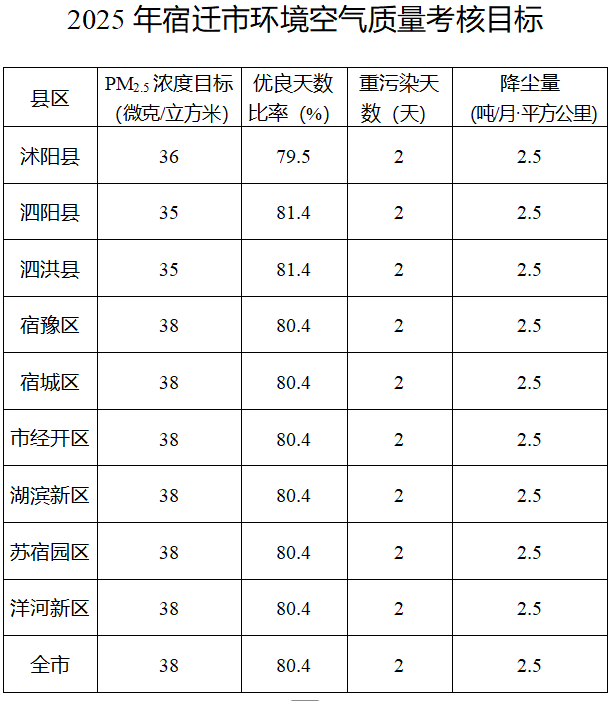 2025年全市PM2.5浓度达到38μg/m3及以下,空气质量优良天数比例达到80.4%,重污染天控制在2天以内。完成省下达的氮氧化物、挥发性有机物减排目标。各县区空气质量实现持续改善,目标详见附件1。